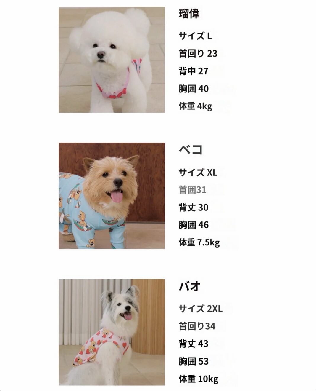 ※商品サイズをお選びいただく際、着丈が長すぎなければ、胸囲と首回りはペットの測定サイズより1〜2cmほど余裕を持ってお選びください。