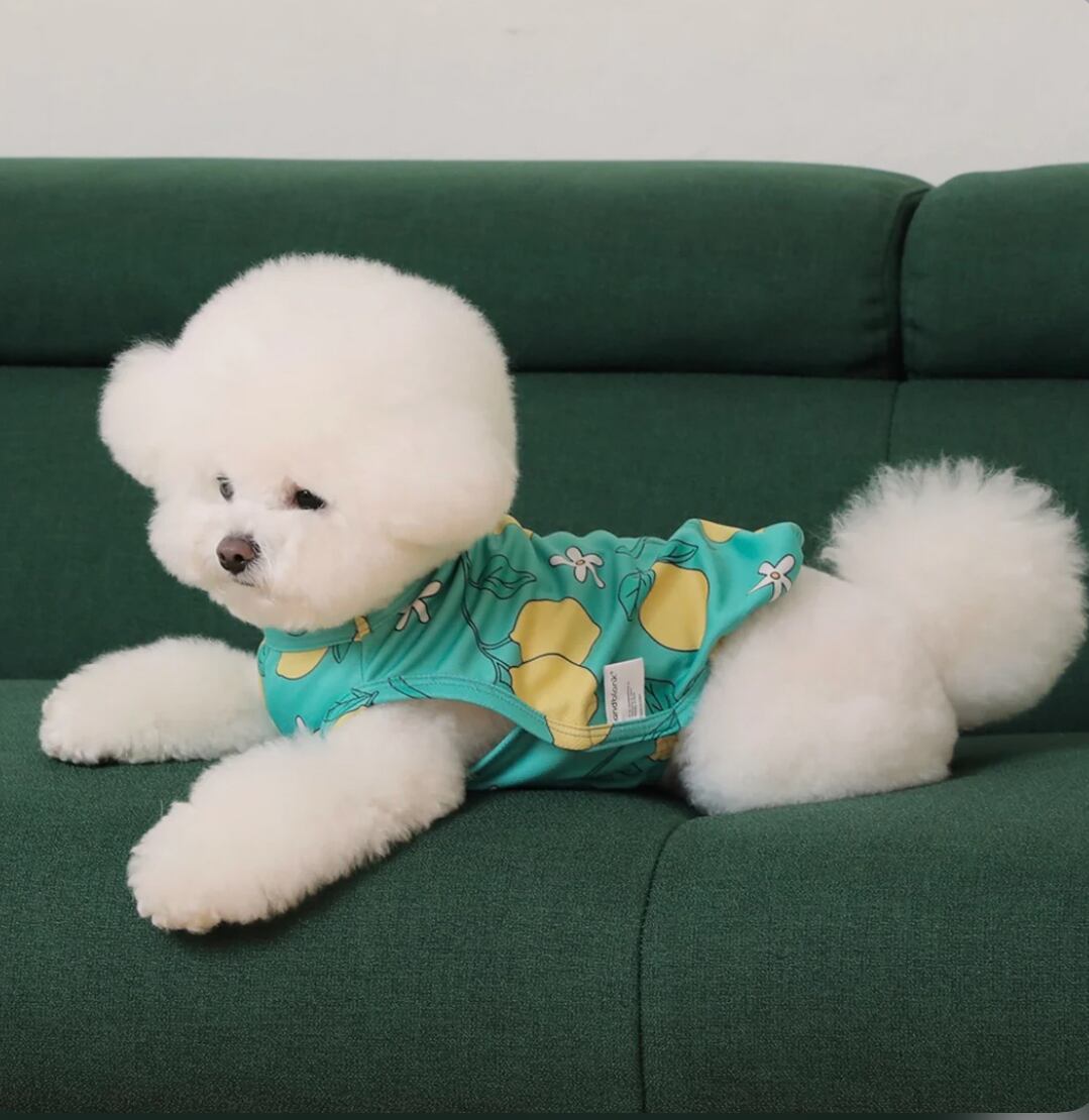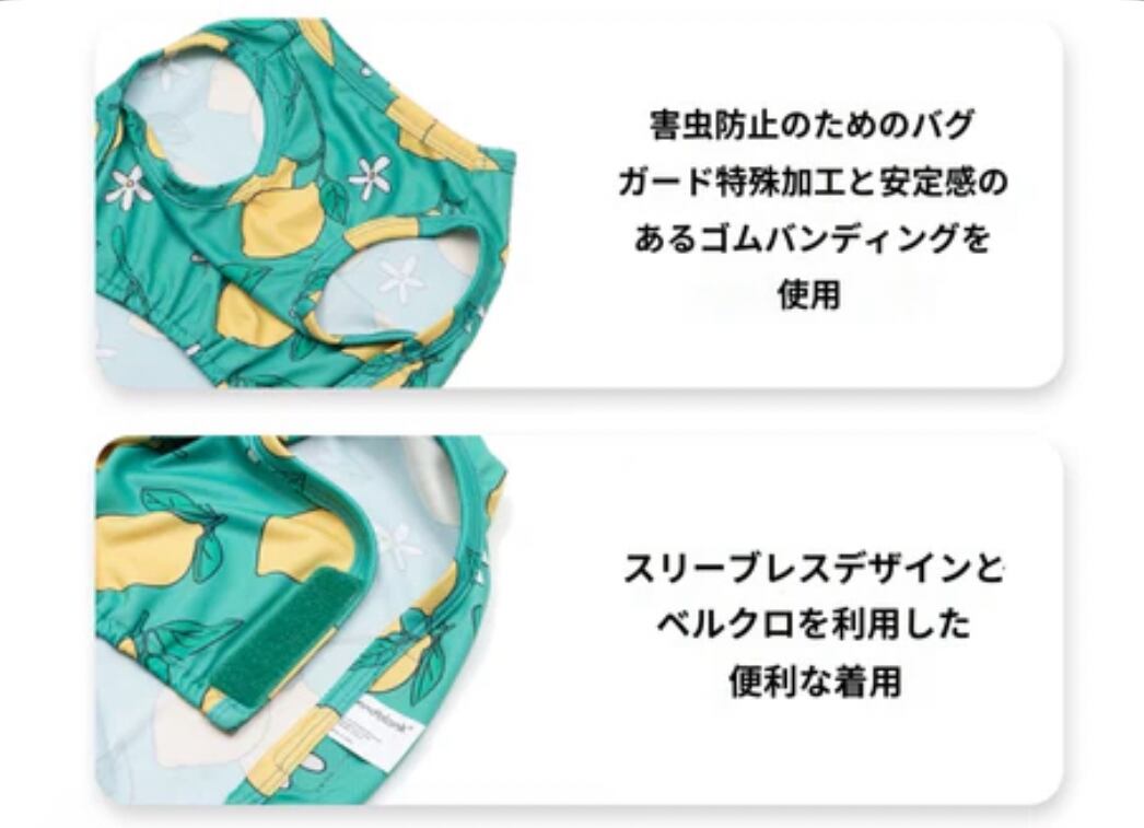 夏の必須機能「防虫」と「保冷」を結合させた機能性服。特許取得済みの特殊防虫技術で製作された毎年大人気のand blankのクールバグガードトップスは、夏に涼しい通気性の良いクーロン原糸を使用した機能性生地で作られており、紫外線もカットし、速乾機能のある肌ざわりも良く暑い夏を快適に過ごすことができます。洋服を水に濡らしてから使用することで、より愛犬の体温を下げるのに役立ちます!着用時は頭からかぶせるだけなので、とても簡単!