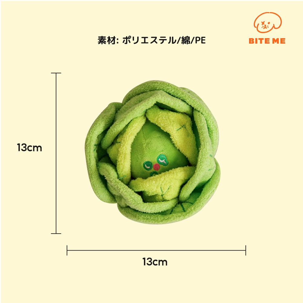 新鮮シャキシャキの美味しいキャベツがノーズワークトイになりました。 キャベツの葉と真ん中のボールが、柔らかいマジックテープで分離するおもちゃです。 葉の間や、ボールのおやつポケットにお気に入りのおやつを隠して遊べるノーズワークトイになっています。 わんちゃんがキャベツからおやつを探すのにきっと夢中になるはず。 難易度も調整できるので初めてのノーズワークトイにも◎
