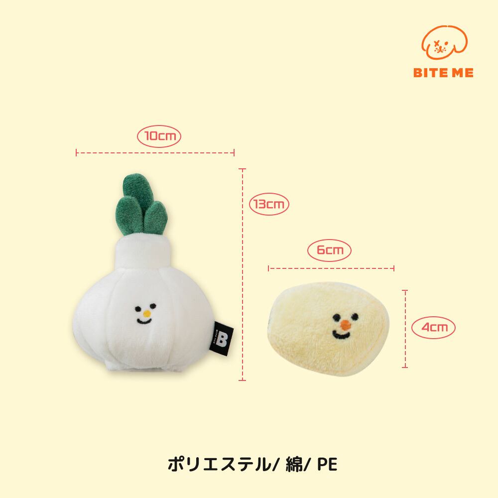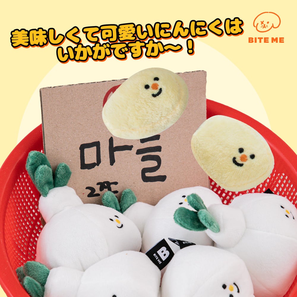 色とりどりでふわふわ柔らかい農産物シリーズにはそれぞれワンちゃんを楽しませる秘密があります。 にんにくおもちゃは中に可愛いにんにく2粒が隠れています。 中におやつを隠してにんにくの粒を入れれば、難易度の高いノーズワークをすることができます!