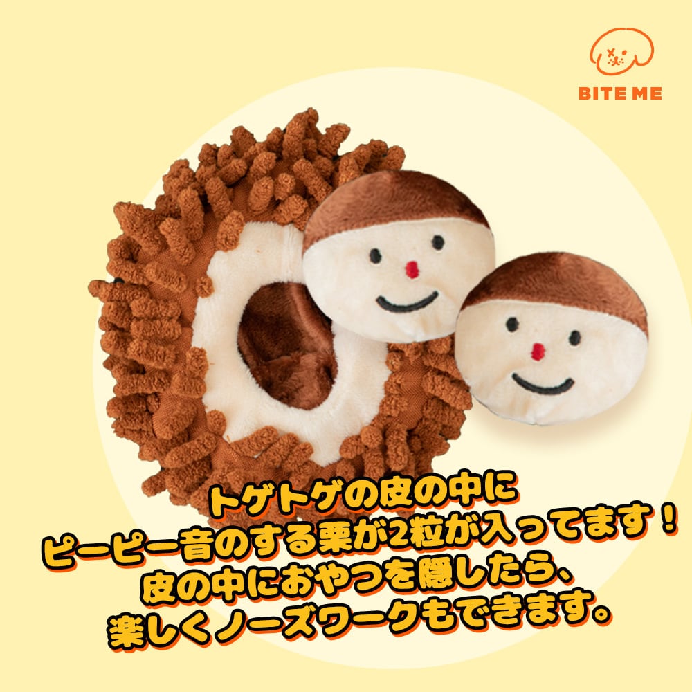 秋を感じられるほくほくの焼き栗はトゲトゲの皮の中にピーピー音のする栗が2粒入っています! トゲトゲの皮の中にお気に入りのおやつやフードを隠して楽しくノーズワーク遊びができます。