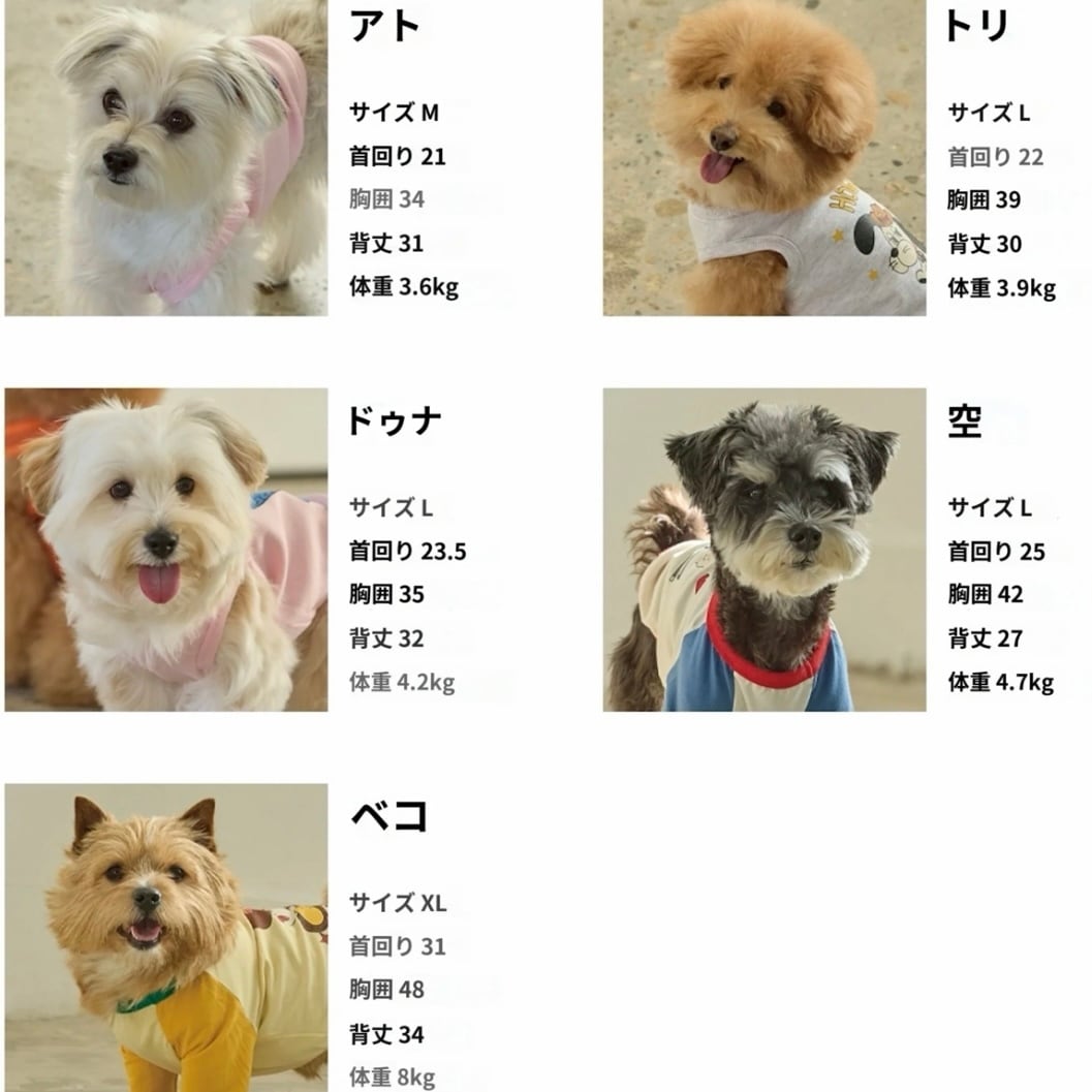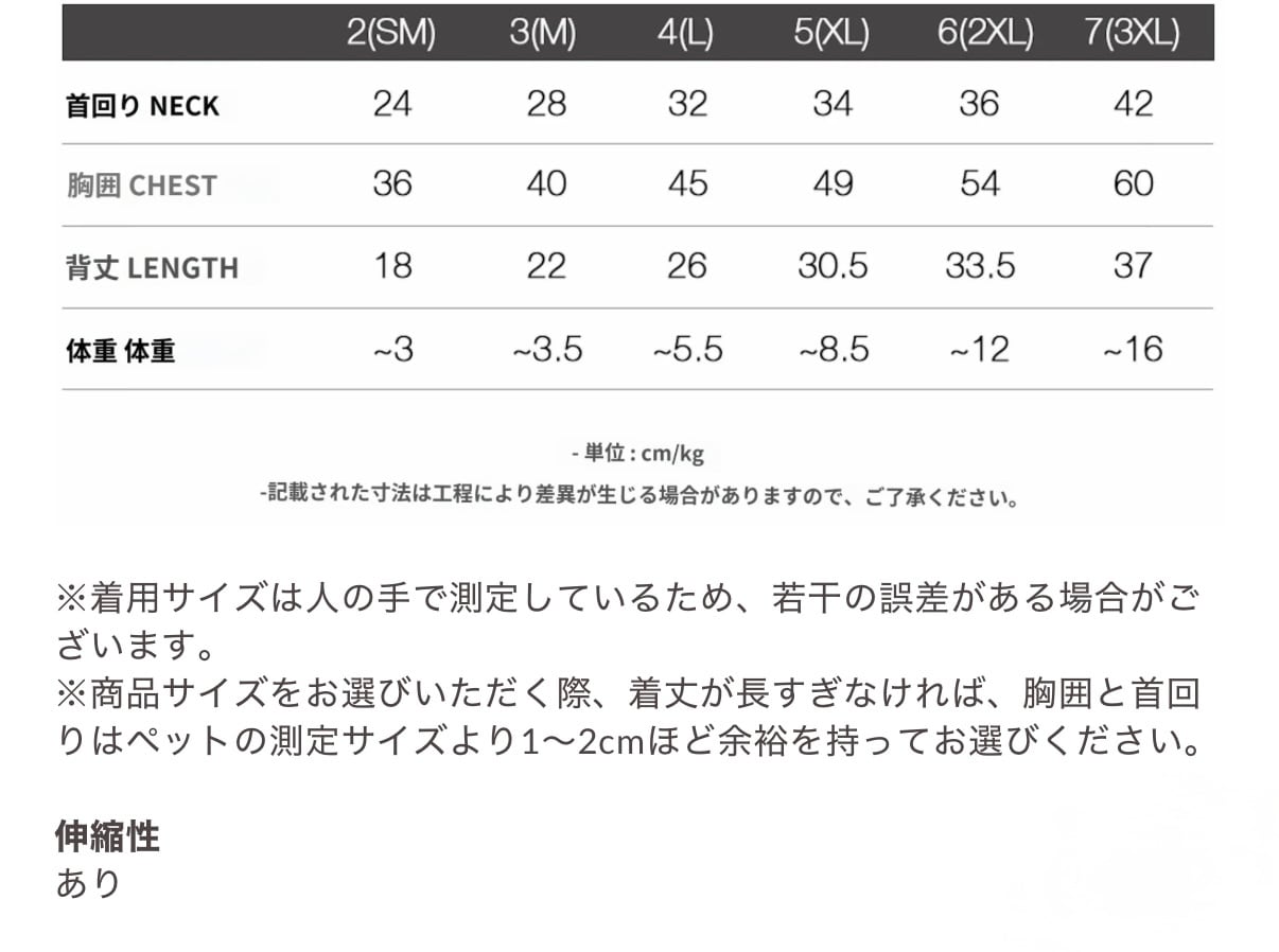 ※商品サイズをお選びいただく際、着丈が長すぎなければ、胸囲と首回りはペットの測定サイズより1〜2cmほど余裕を持ってお選びください。