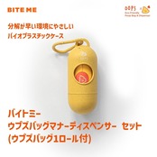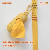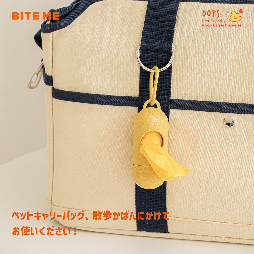 バイトミーから環境に優しいエコ素材のうんち袋ケースとうんち袋1つがセットで登場☆彡ケースとカナビラは環境に優しい素材「バイオプラスチック」を使用しました。 セットのうんち袋(1ロール15枚入り)もトウモロコシでんぷんから作った自然分解されるビニールです。 カプセル型のケースはさりげないうんちのアイコンが可愛いく、毎日のお散歩に重宝します。 リードやお散歩バッグのDカンに取り付けて持ち運びできるので楽チンです。