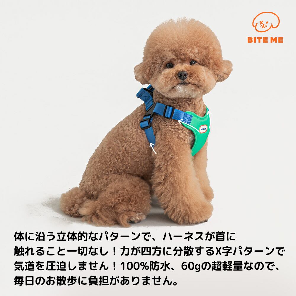 コンフォートハーネス(5カラー) 体への負担が最も少ないハーネス!ハーネスが嫌いな子でも簡単に着用できる毎日着用しても快適なハーネス! バックルたったひとつで全て完了!着脱がとても簡単です。 体に沿う立体的なパターンで、ハーネスが首に触れること一切なし!力が四方に分散するX字パターンで気道を圧迫しません! 100%防水、60gの超軽量なので、毎日のお散歩に負担がありません。