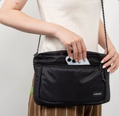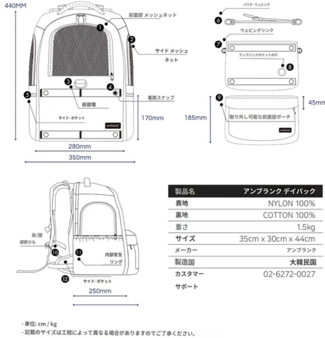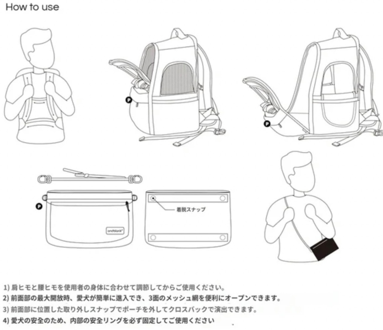 バックパックのフロントポケットに付いたポーチは収納力も抜群のため、バッグを使用しない際は斜めがけのお散歩バッグとしてご使用いただけます。