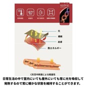 エアロヒートとは、原糸内に特殊なミネラル物質が太陽及び室内照明の光を吸収することで、それを熱エネルギーに変えて発熱する機能性素材です。