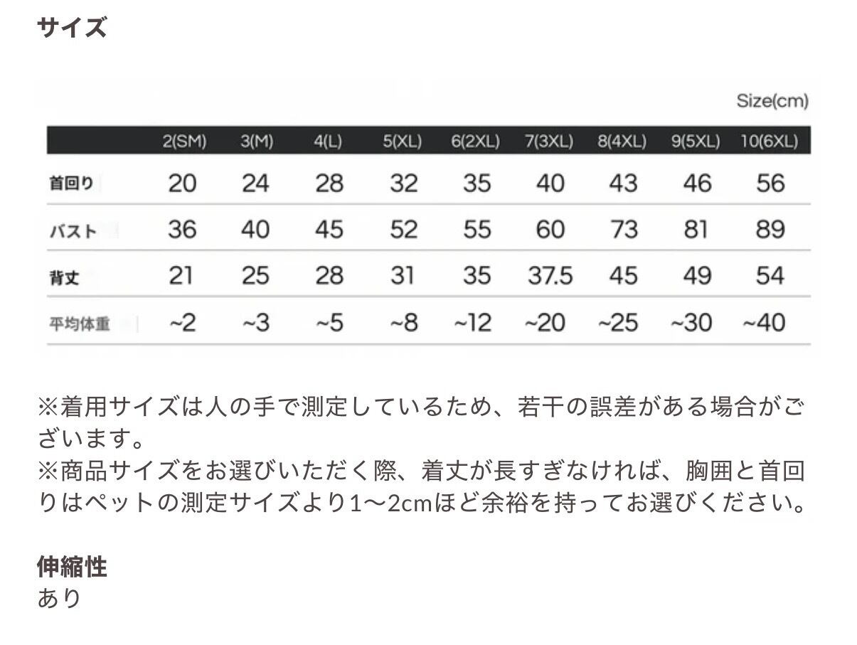 ※商品サイズをお選びいただく際、着丈が長すぎなければ、胸囲と首回りはペットの測定サイズより1〜2cmほど余裕を持ってお選びください。